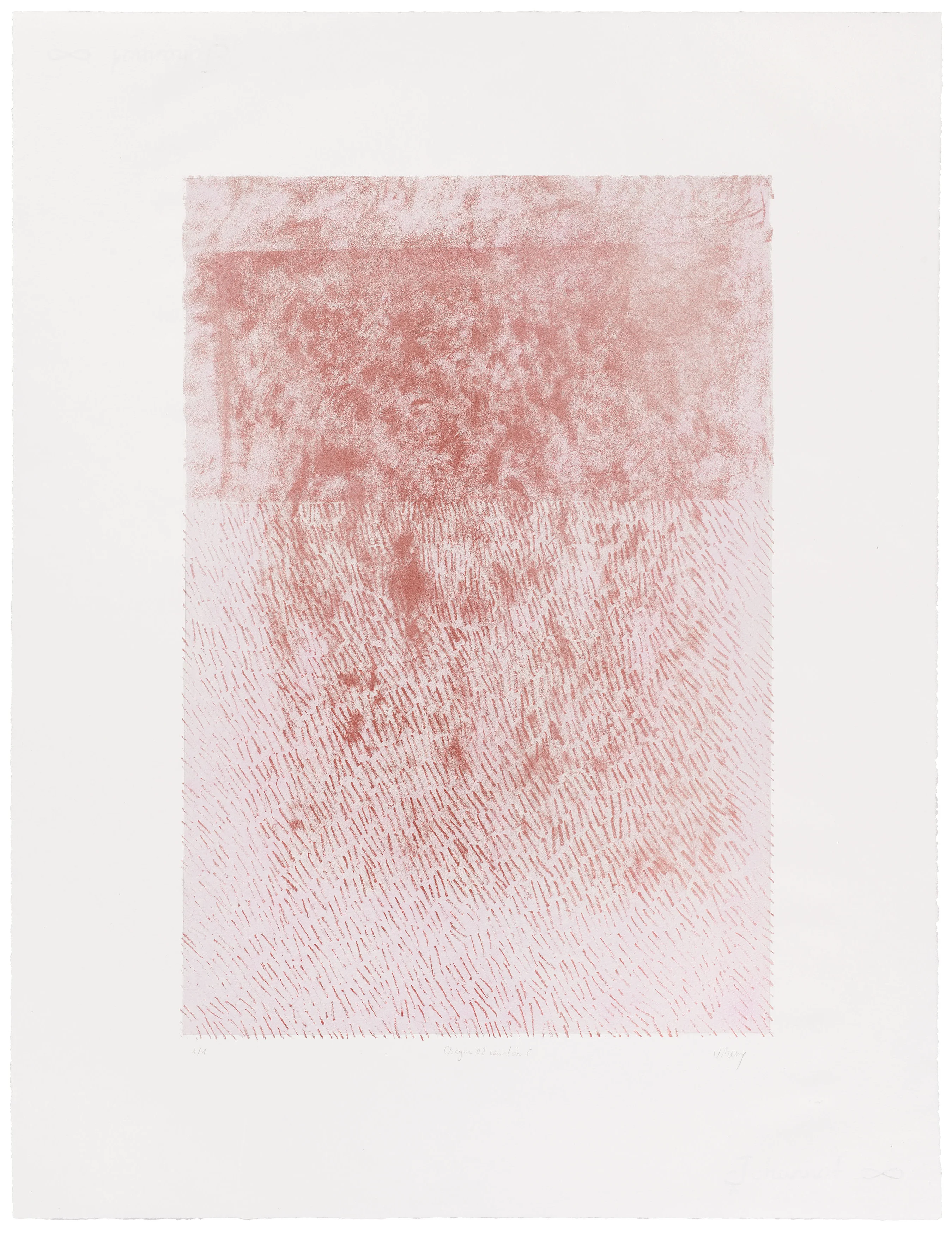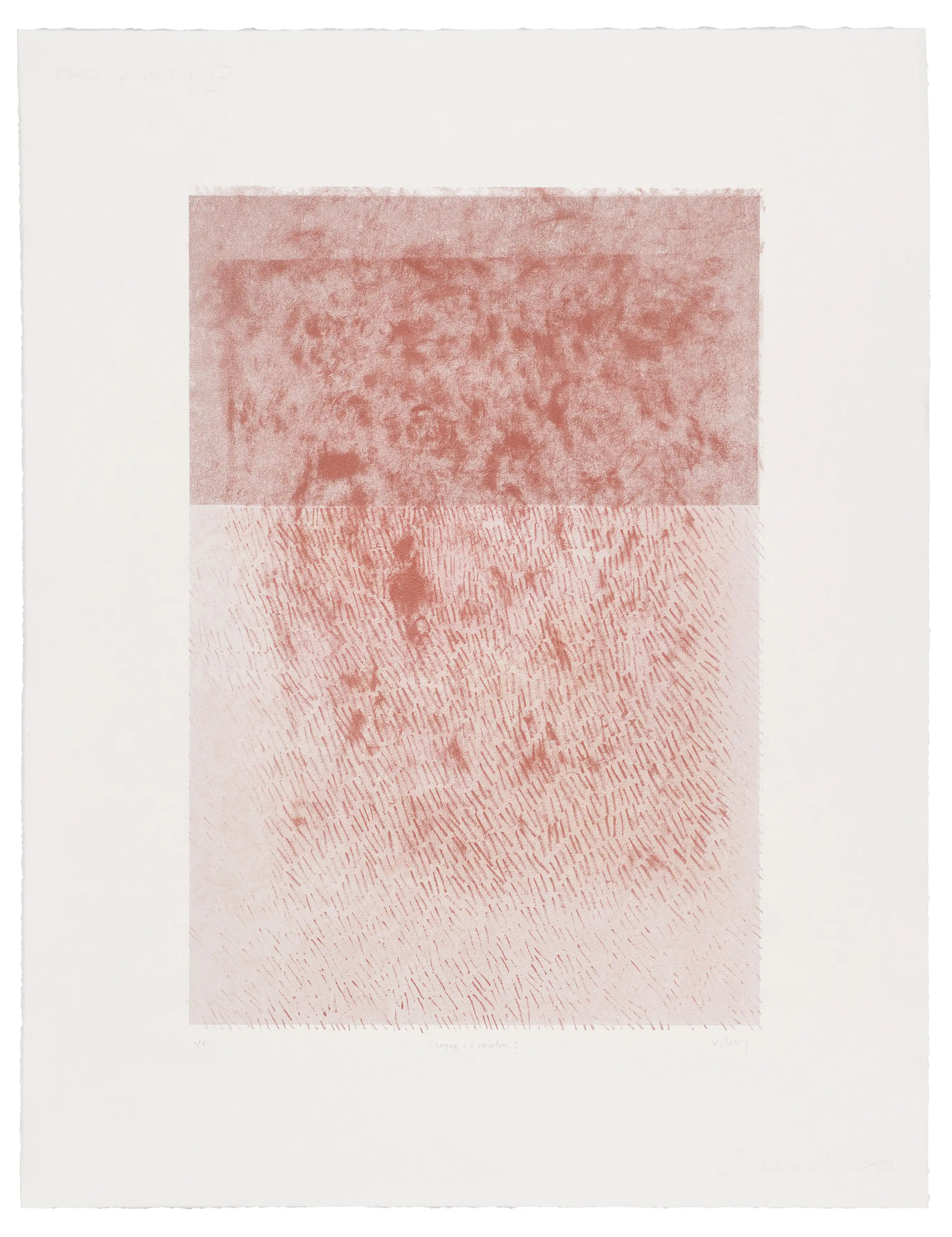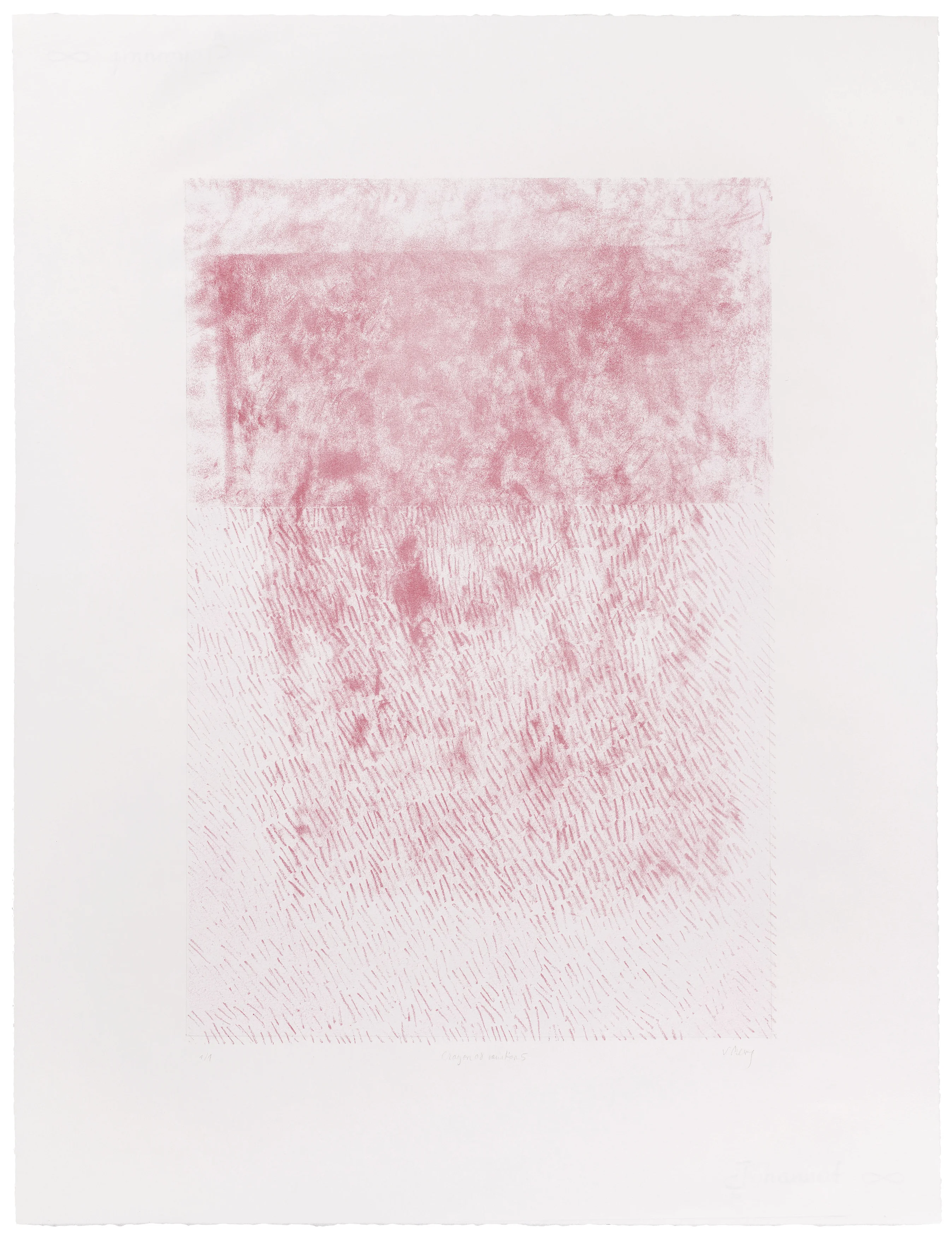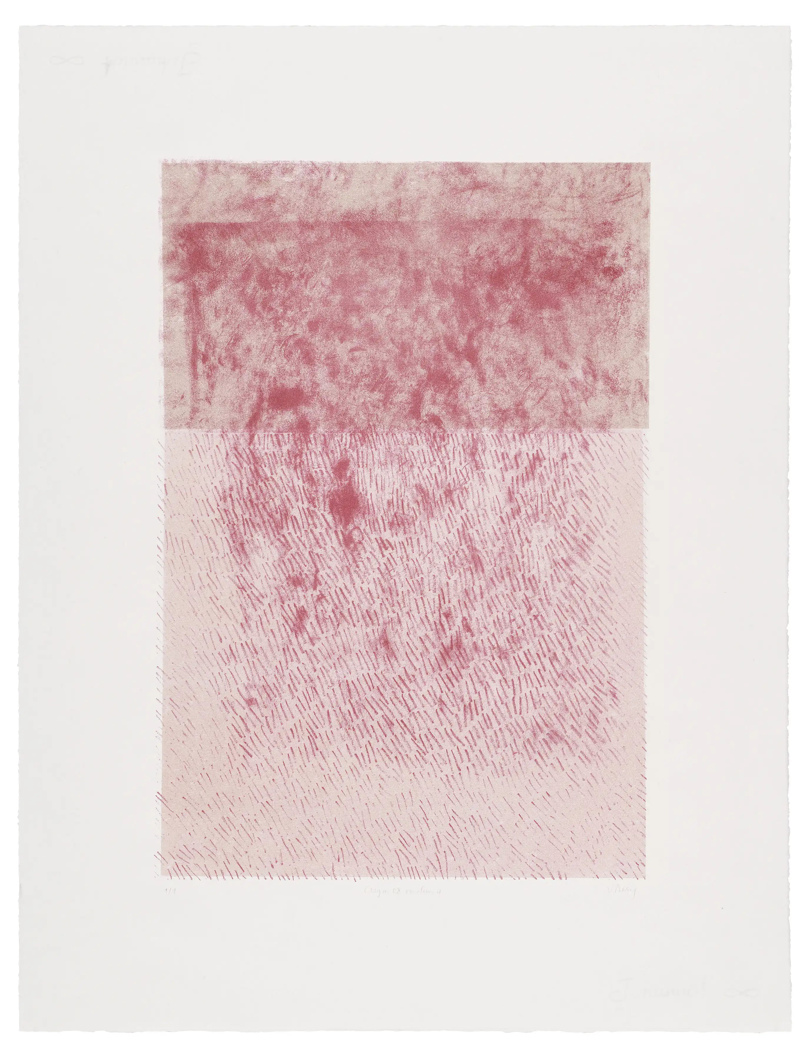 Dry drawing materials and the study of colour are at the heart of the lithographs, printed from a small stone or large ball-grained aluminium plates. "Crayon 02" variations are enriched with hand colouring, chine collé, monoprinting and photoplate marks. For "Crayon 07" variations, a set of three plates is used and counter-etched several times to transform the drawing. "Crayon 08" variations are printed from a single plate with added monoprinting; the lithographs focus on the ambiguous colour pink.