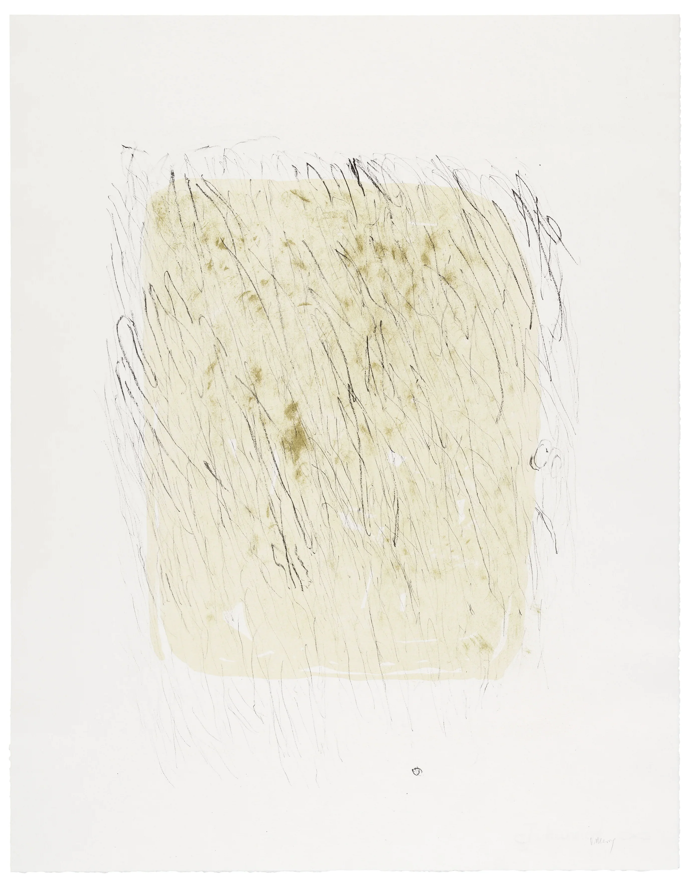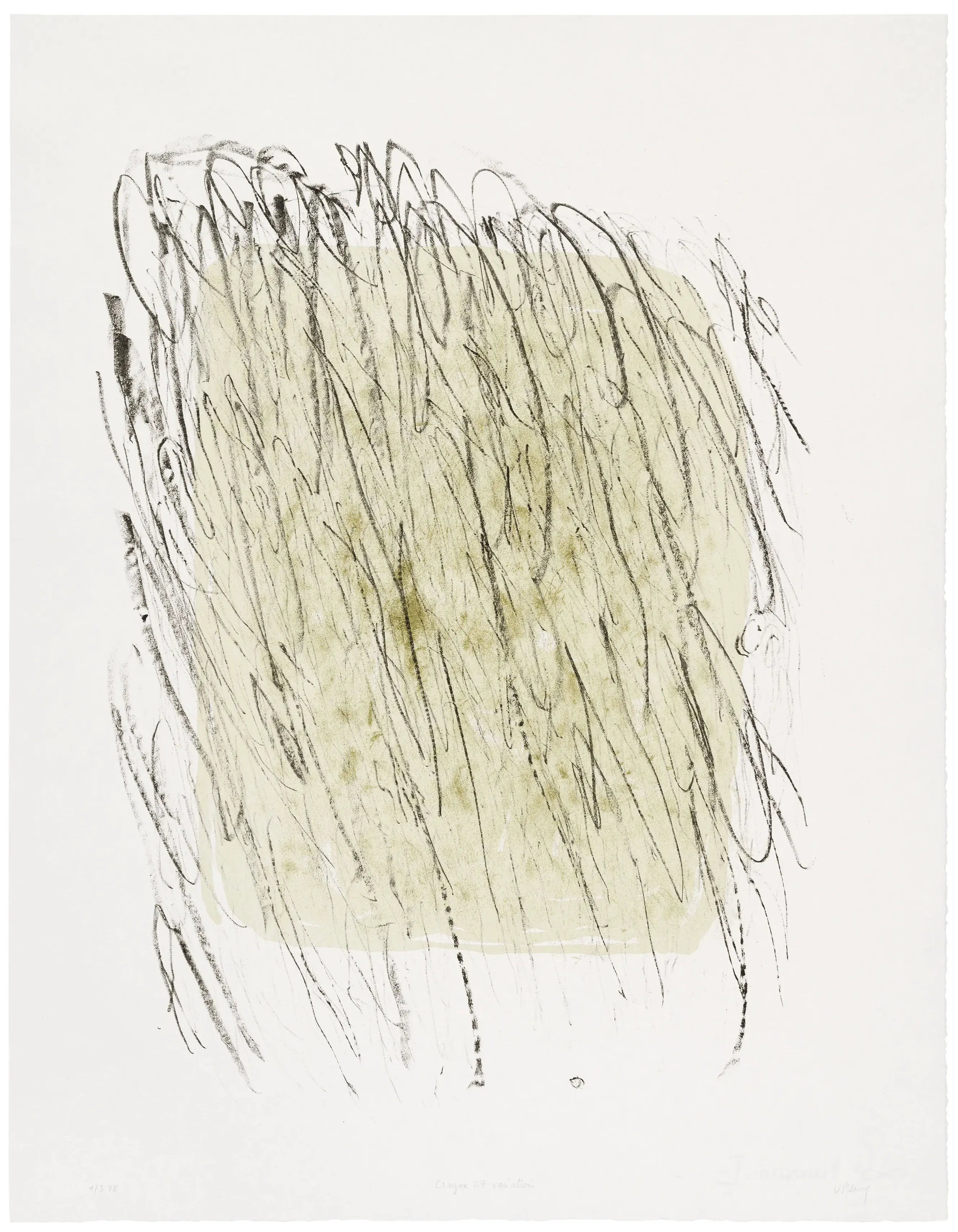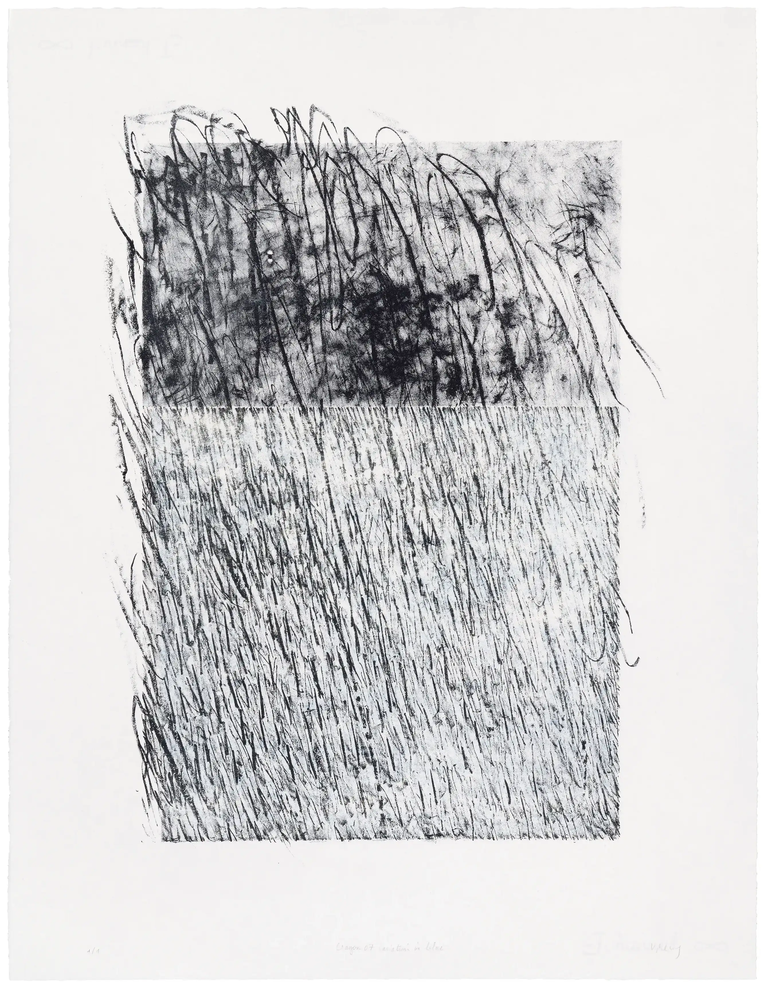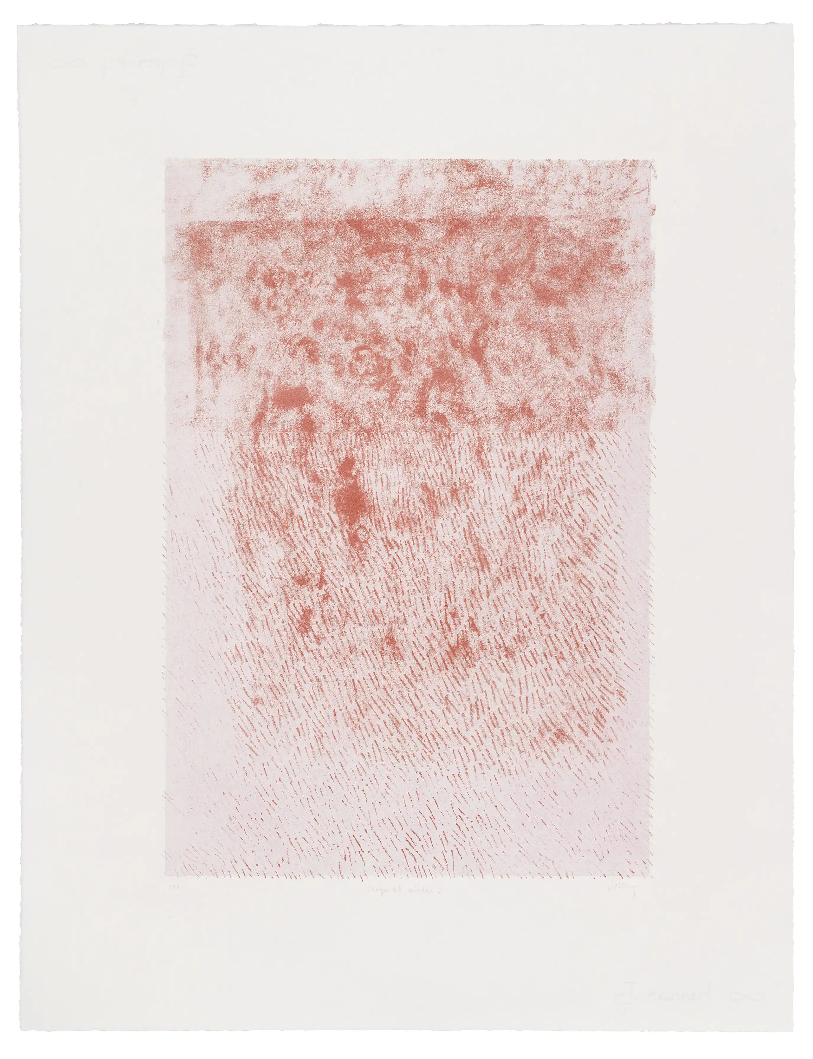 Dry drawing materials and the study of colour are at the heart of the lithographs, printed from a small stone or large ball-grained aluminium plates. "Crayon 02" variations are enriched with hand colouring, chine collé, monoprinting and photoplate marks. For "Crayon 07" variations, a set of three plates is used and counter-etched several times to transform the drawing. "Crayon 08" variations are printed from a single plate with added monoprinting; the lithographs focus on the ambiguous colour pink.