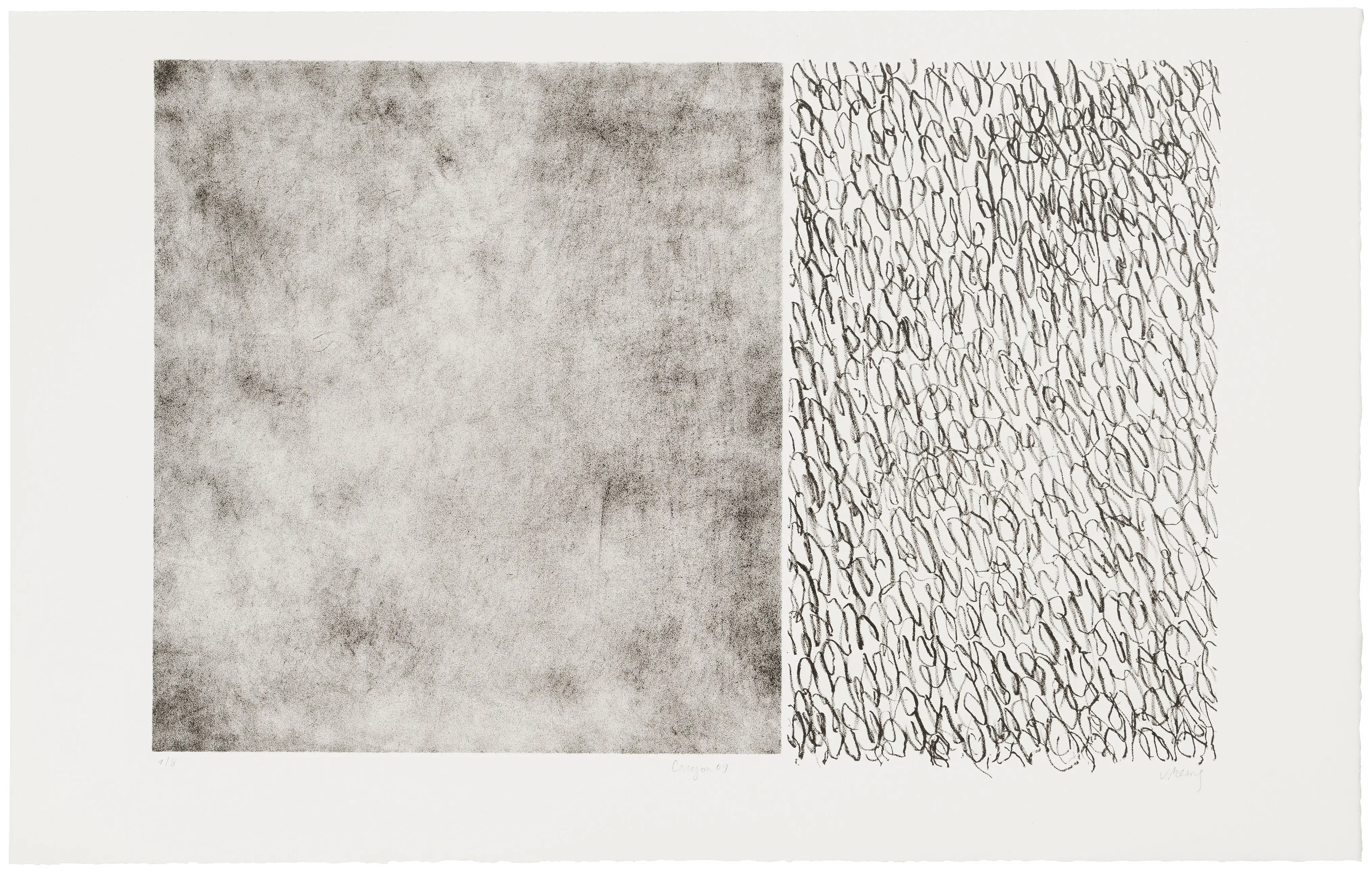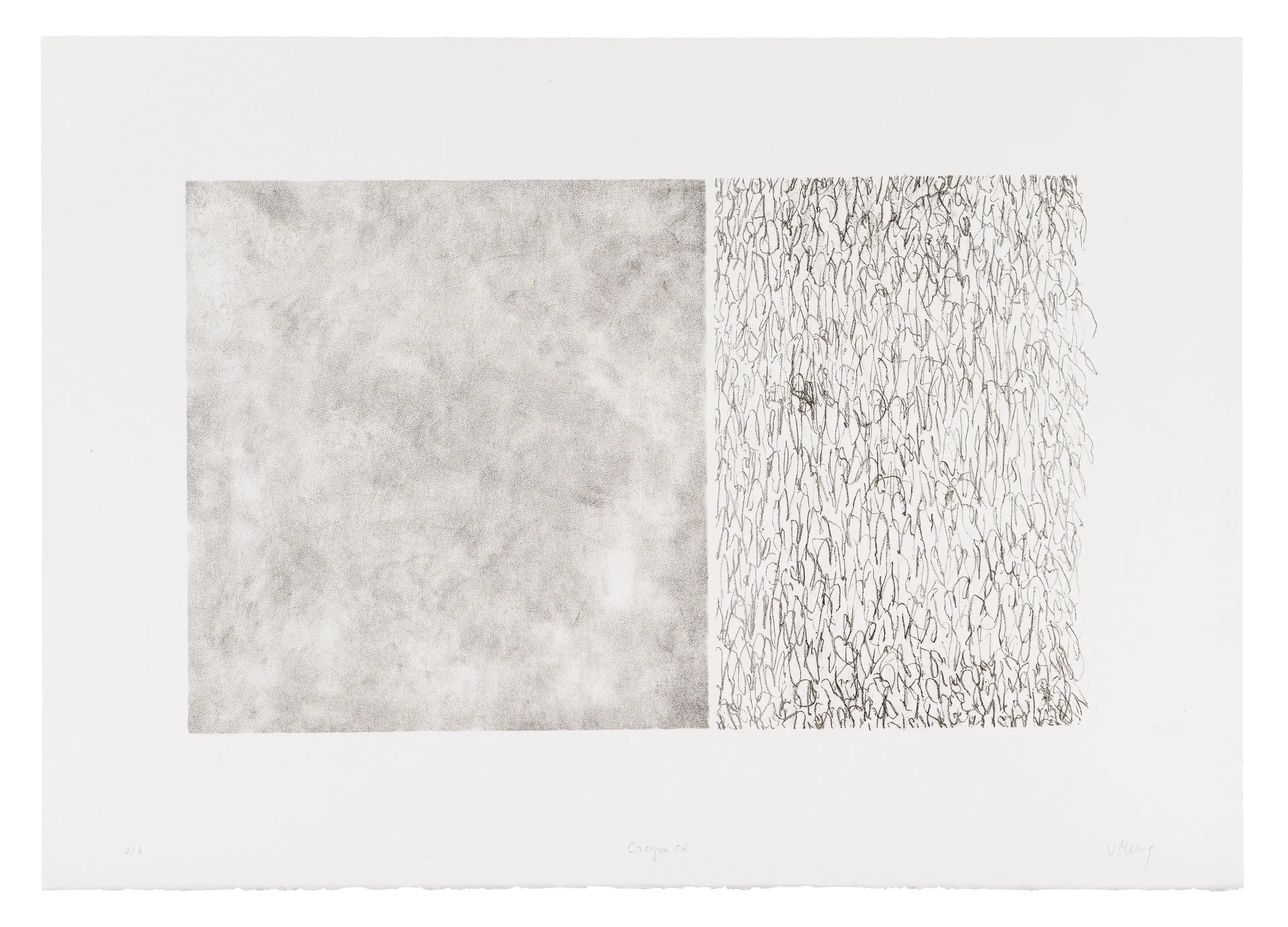 In the ongoing "Crayon" series, drawing possibilities are narrowed to black crayon marks and smoky surfaces of grey. Lines, light and tones create tension. The softness from a rubbing crayon – like an air current – responds to the scribble of a lithographic crayon. Will the viewer see where drawing decisions were made? How much hand pressure was at play? Why a ghost mark has been left on the limestone?